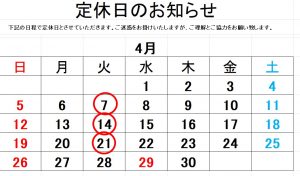 4月の定休日ですが